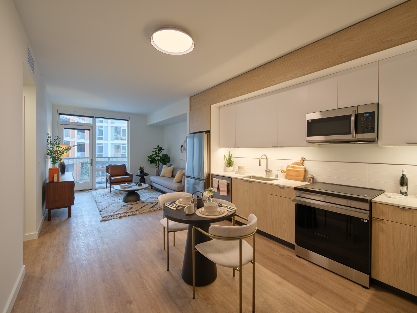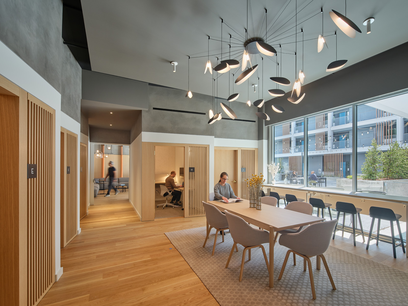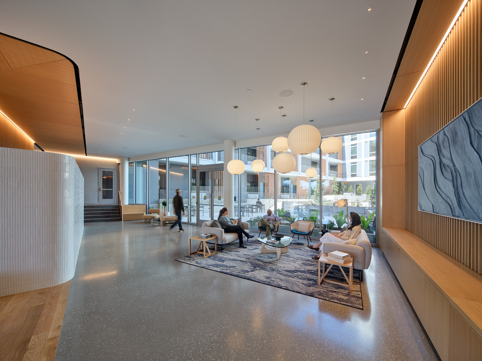 Hawkins was designed to respond to the park-like setting of the new Treasure Island neighborhood. The building’s main lobby faces Treasure Island’s central cultural park. This natural setting served as an inspiration to carefully consider the residents’ entry experience. As residents approach from the ferry terminal through the park, a direct line of sight through the glazed lobby provides a clear visual connection to the central landscaped courtyard. This connection between exterior and interior is carried throughout the design of the building, with the building’s interior finishes inspired by natural palettes.
